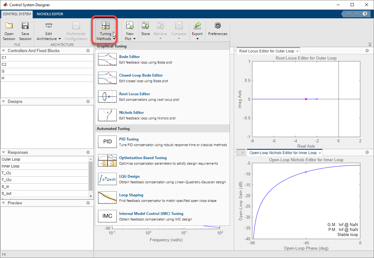 | Редактор Николса | Настройте компенсатор, чтобы получить определенный отклик с разомкнутым контуром (формирование контура), комбинируя информацию о коэффициенте усиления и фазе на графике Николса. | Регулировка полосы пропускания с разомкнутым контуром и проектирование с учетом характеристик коэффициента усиления и запаса по фазе. |