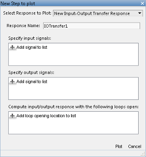 Откроется новое диалоговое окно печати, в котором можно указать входные и выходные данные той части системы управления, ответ которой требуется построить. Например, выберите Создать шаг (New step), чтобы создать график ответа шага из указанных входных данных в указанные выходные данные системы.