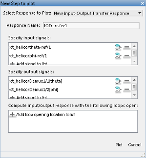 Аналогично, укажите местоположения, в которых измеряется отклик шага, в списке выходов отклика шага. Например, следующая конфигурация строит график ответа MIMO на ввод шага, примененный в theta-ref и phi-ref и измерено при theta и phi в модели Simulink rct_helico.