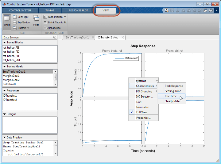 Просмотрите характеристики отклика, такие как время подъема или пиковые значения, щелкнув правой кнопкой мыши на графике. Другие возможности управления и организации нескольких графиков доступны на вкладке Вид (View).