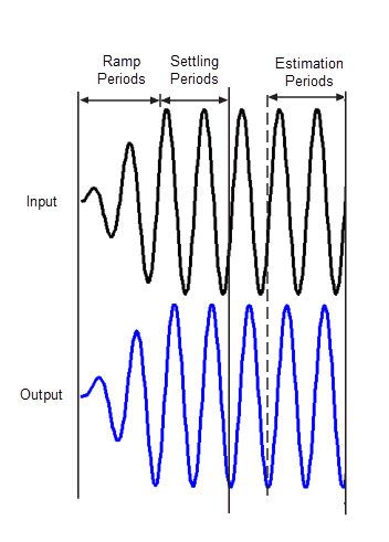 Количество расчетных периодов - это общее количество периодов минус количество расчетных периодов. Алгоритмы оценки отбрасывают данные ответа, собранные во время периодов изменения и периодов установления временных кадров. Это позволяет вымирать любым переходным реакциям. Алгоритм использует данные, собранные в течение периодов оценки, для вычисления оцененной частотной характеристики.