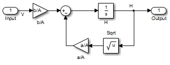 Вода поступает в бак сверху со скоростью, пропорциональной напряжению, приложенному к насосу. Вода выходит через отверстие в основании резервуара со скоростью, пропорциональной квадратному корню высоты воды в резервуаре. Наличие квадратного корня в расходе воды приводит к нелинейной установке. На основании этих расходов скорость изменения объема резервуара составляет: