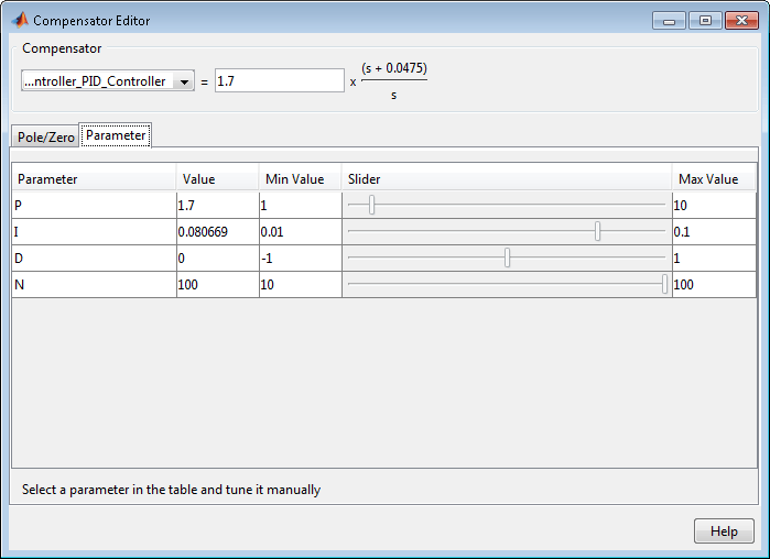 В диалоговом окне «Редактор компенсаторов» на вкладке «Параметры» настройте коэффициенты усиления контроллера PID. Дополнительные сведения о редактировании параметров компенсатора см. в разделе Настройка блоков Simulink с помощью редактора компенсаторов.