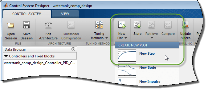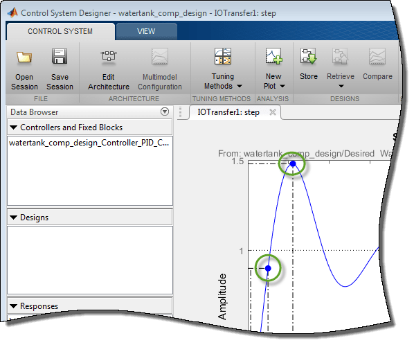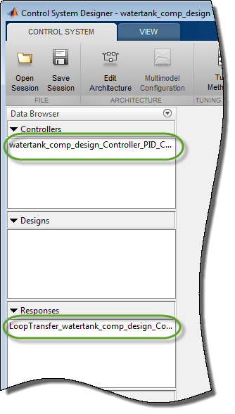 Приложение добавляет контроллер PID в браузер данных в разделе Контроллеры и фиксированные блоки. Приложение также вычисляет функцию передачи с разомкнутым контуром на выходе блока PID Controller и добавляет этот ответ в браузер данных.