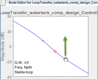 На графике Bode Editor перетащите отклик величины вверх, чтобы увеличить коэффициент усиления компенсатора. Увеличивая коэффициент усиления, вы увеличиваете пропускную способность и ускоряете отклик.