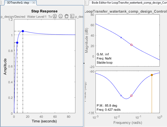 При открытии конструктора систем управления в список Расположения (Locations) добавляются все точки анализа, ранее определенные в модели Simulink. Для watertank_comp_design, есть два таких сигнала.