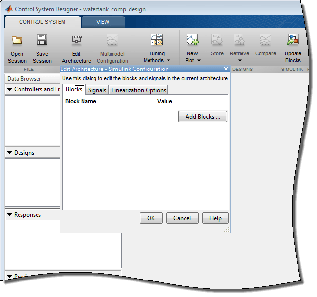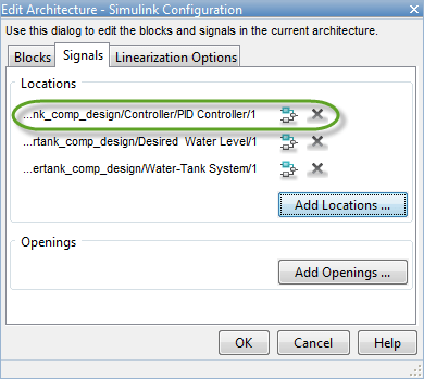 В диалоговом окне Изменить архитектуру приложение добавляет выбранный блок контроллера в список блоков для настройки на вкладке Блоки. На вкладке Signals приложение также добавляет выходные данные блока PID Controller в список точек анализа Locations.