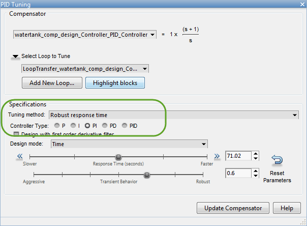 Чтобы настроить компенсатор с помощью автоматической настройки PID, нажмите Tuning Methods и выберите PID Tuning.