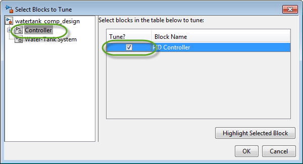 В диалоговом окне «Выбор блоков для настройки» на левой панели выберите подсистему контроллера. В столбце «Настройка» установите флажок для контроллера PID.