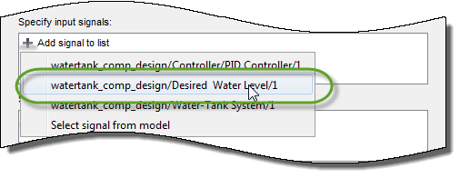 Чтобы добавить входной сигнал, в области Задать входные сигналы (Specify input signals) щелкните +. В раскрывающемся списке выберите выход блока «Требуемый уровень воды».