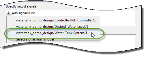 Чтобы добавить выходной сигнал, в области Задать выходные сигналы (Specify output signals) щелкните +. В раскрывающемся списке выберите выход блока «Система резервуаров для воды».
