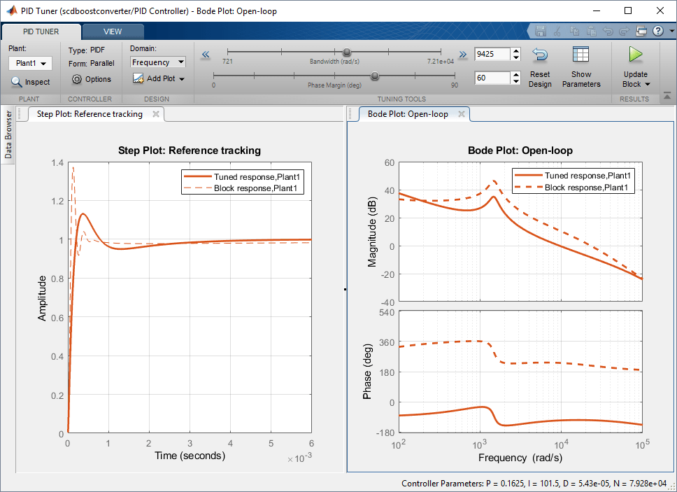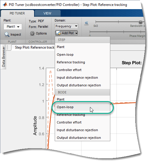 Чтобы настроить контроллер на основе полосы пропускания и запаса по фазе, на вкладке PID Tuner в выпадающем списке Domain выберите Frequency.