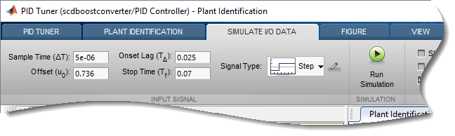 Для определения модели завода сначала необходимо получить входные/выходные данные путем моделирования модели. На вкладке Идентификация завода щелкните Получить данные ввода-вывода > Смоделировать данные. Для идентификации завода необходимо указать конечное значение времени остановки модели Simulink.
