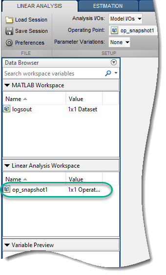 Программа моделирует модель и создает рабочую точку, которая содержит входные значения и значения состояния модели в указанное время снимка. Эта рабочая точка, op_snapshot1, добавляется в рабочее пространство линейного анализа.