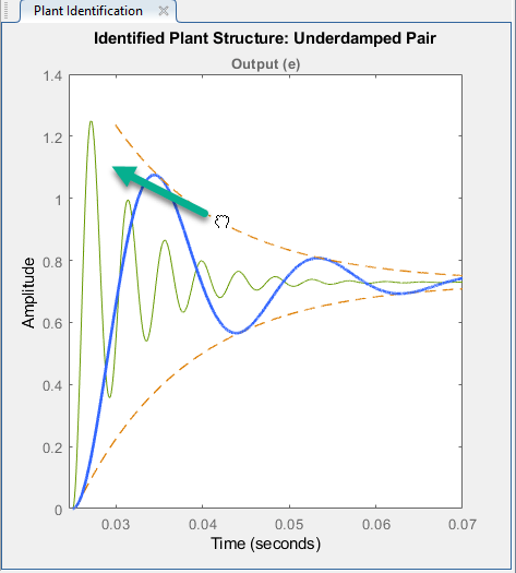 Чтобы получить грубую аппроксимацию идентифицированного растения, на графике Идентифицированная структура растения перетащите пунктирные линии, которые соответствуют огибающей ответа шага. Отрегулируйте отклик так, чтобы он аппроксимировал выходной отклик.
