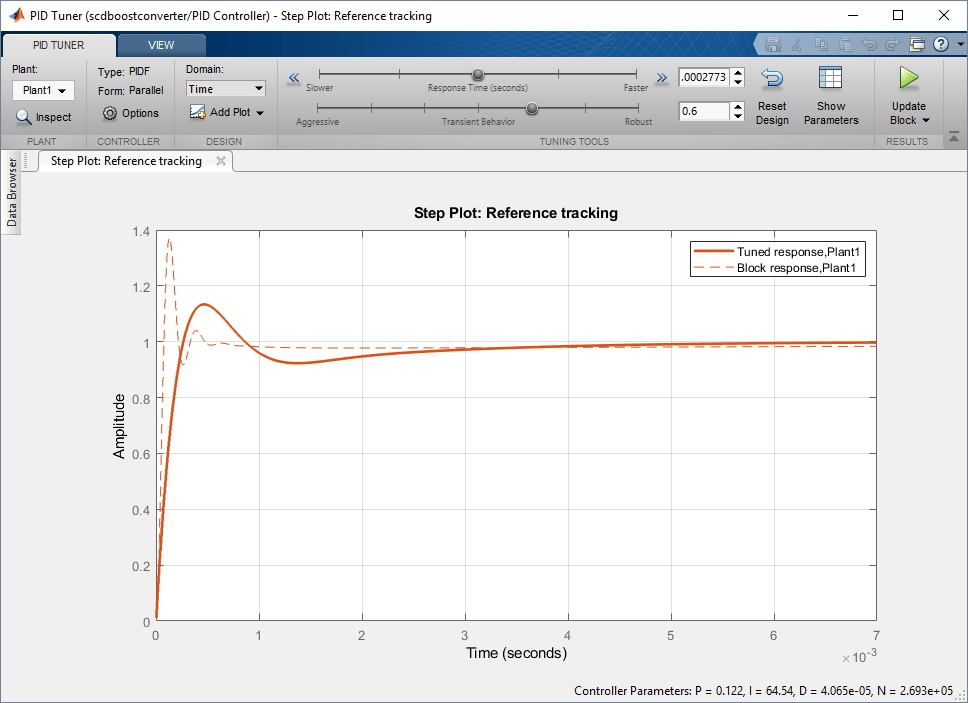 PID Tuner выбирает параметры контроллера, соответствующие этим проектным спецификациям.