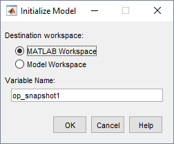 В диалоговом окне Инициализация модели (Initialize Model) выберите Рабочее пространство MATLAB (MATLAB Workspace) и нажмите кнопку ОК. Программа экспортирует рабочую точку в рабочее пространство MATLAB ® и инициализирует модель с входами и состояниями в рабочей точке.