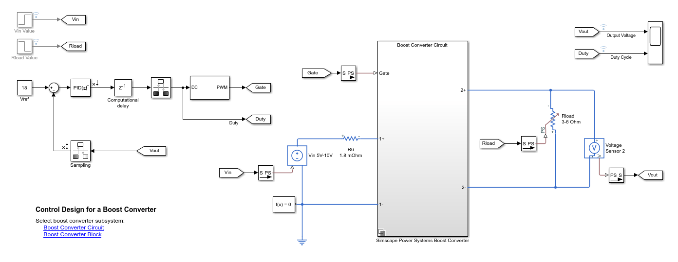 В этой модели для переключения используется МОП-транзистор, управляемый сигналом широтно-импульсной модуляции (ШИМ). Выходное напряжение Vout должно регулироваться до опорного значения Vref. Цифровой контроллер PID регулирует рабочий цикл PWM, Duty, на основе сигнала ошибки напряжения. В этом примере оценивается линейная модель от рабочего цикла ШИМ до напряжения нагрузки Vout.