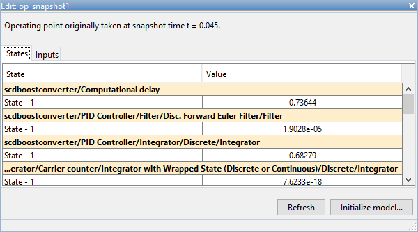 Чтобы инициализировать модель с вычисленной рабочей точкой, дважды щелкните op_snapshot1.