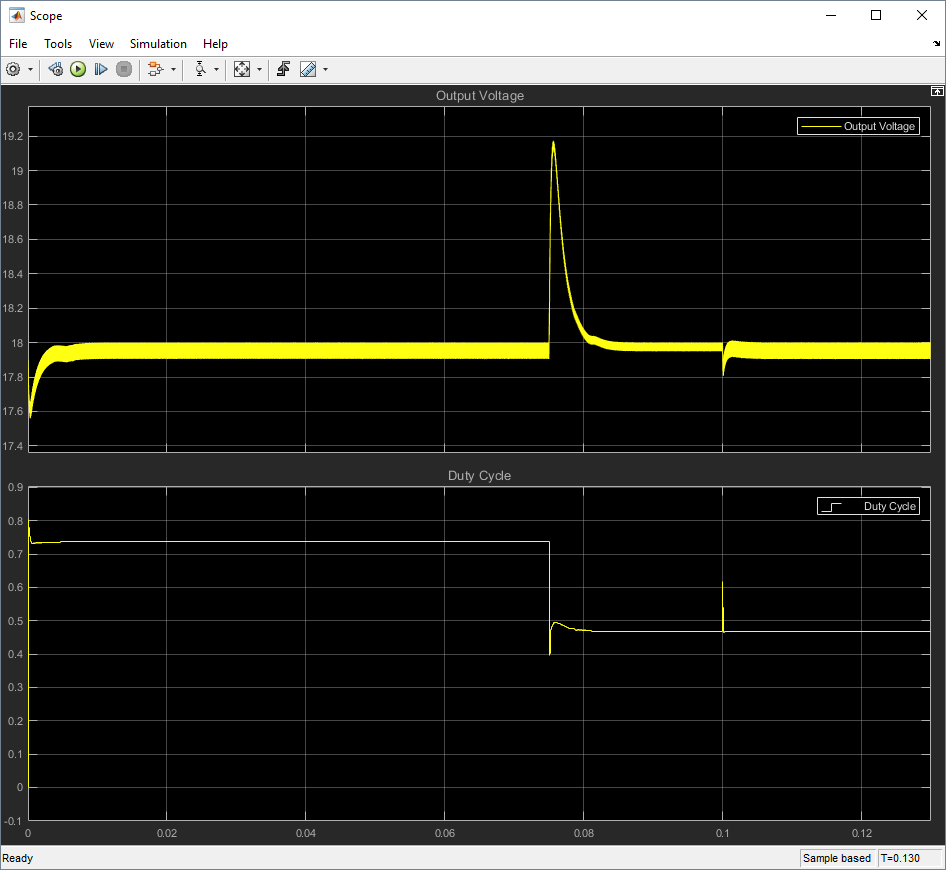 Можно проверить производительность настроенного контроллера с помощью моделирования с возмущениями линии и нагрузки. Для проверки динамических характеристик контроллера в модели Simulink используются следующие возмущения: