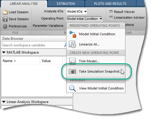 В линеаризаторе модели на вкладке Линейный анализ (Linear Analysis) в раскрывающемся списке Рабочая точка (Operating Point) выберите Сделать имитационный снимок (Take Simulation Snapshot).