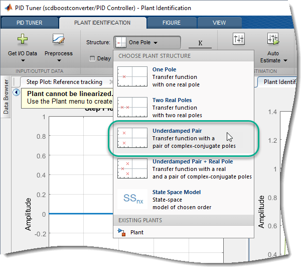 На закладке Plant Identification (Идентификация завода) выберите структуру завода для идентификации на основе знаний о заводе и внешнего вида ответа шага вывода. В этом примере выходной отклик выглядит как недостаточно демпфированный отклик второго порядка. В раскрывающемся списке Структура (Structure) выберите Неполная пара (Underdamped Pair).