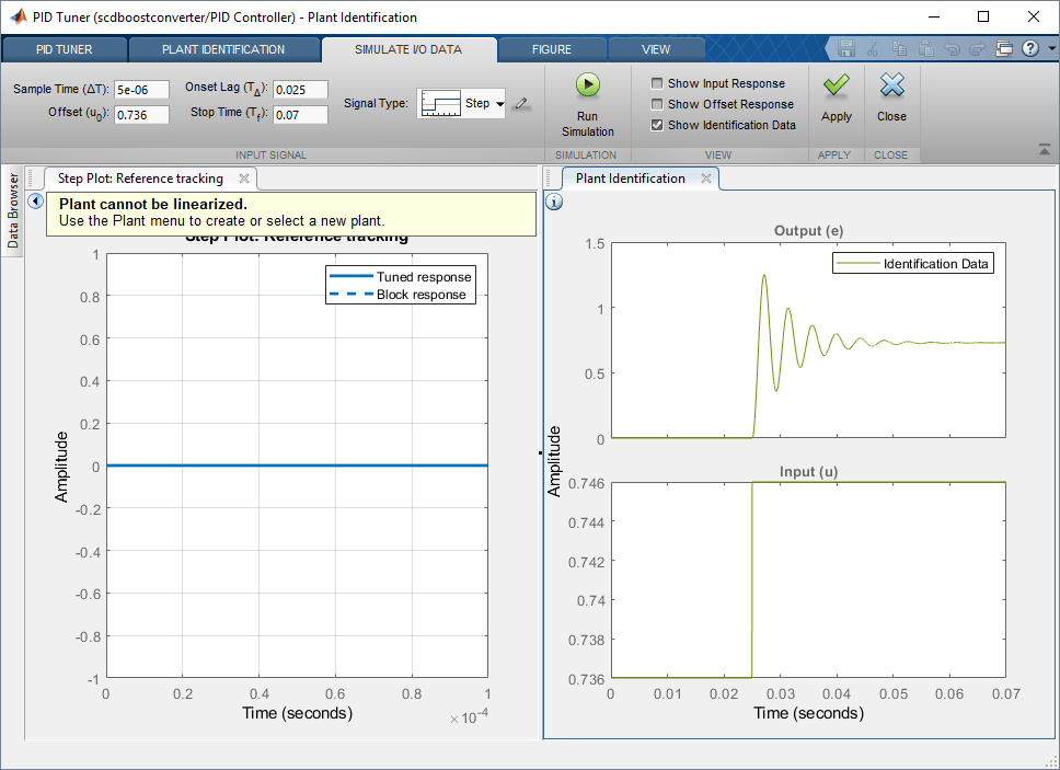 Чтобы получить линейную модель установки, на вкладке «PID Tuner» выберите «Plant», а затем в разделе «Create a New Plant» выберите «Identify New Plant».