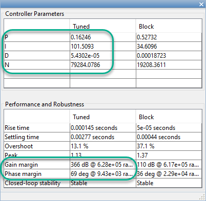 Чтобы просмотреть настроенные параметры контроллера и метрики производительности, включая коэффициенты усиления и поля фазы, щелкните Показать параметры (Show Parameters). Настроенный результат имеет запас усиления 366 дБ и запас фазы 69 ° при 9425 рад/с.