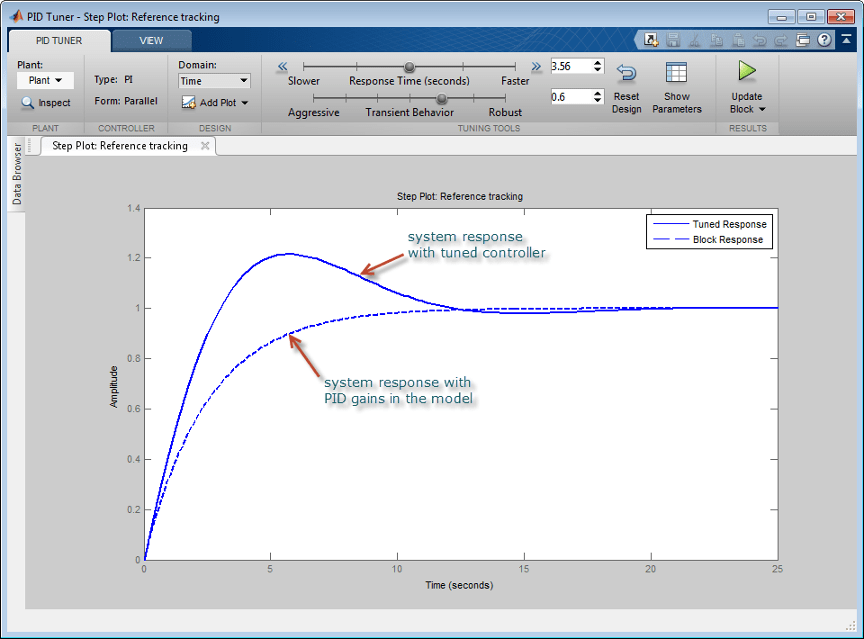 В диалоговом окне блока в раскрывающемся списке «Выбор метода настройки» выберите Transfer Function Based (PID Tuner App). Чтобы открыть PID-тюнер, нажмите кнопку «Настройка».