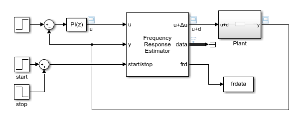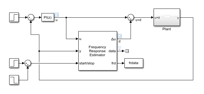 Управляющий сигнал подается в порт u блока оценки частотного отклика. Порт u + Δu подается на вход установки. Перед началом процесса оценки блок подает управляющий сигнал непосредственно от u до u + Δu без добавления какого-либо возмущения. В этом состоянии блок не влияет на поведение системы. (Можно выполнить оценку частотной характеристики в конфигурации с разомкнутым контуром, подключив u к постоянному источнику, который приводит установку к требуемой рабочей точке для оценки. Однако рекомендуется использовать конфигурацию с замкнутым контуром, особенно для оценки в реальном времени. В конфигурации с замкнутым контуром контроллер работает для подавления вводимых возмущений и поддержания безопасной работы установки.)