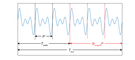 Texp - это длительность эксперимента, заданная при настройке сигнала запуска/остановки (для получения дополнительной информации см. описание порта запуска/остановки на странице ссылок на блок). Для вычисления оценки блок использует только данные, собранные в окне NlongestP. Здесь P является периодом самой медленной частоты в частотном векторе, а Nlongest является значением числа периодов самой низкой частоты, используемых для параметра блока оценки. Все циклы перед этим окном отбрасываются. Таким образом, время оседания Цеттл = Texp - NlongestP. Если вы знаете, что ваша система быстро оседает, вы можете сократить Texp, не меняя Nlongest, чтобы эффективно сократить Tsettle. Если ваша система шумит, вы можете увеличить Nlongest, чтобы получить больше усреднения в окне сбора данных. В любом случае всегда выбирайте Texp достаточно долго для достаточного расчета и достаточного сбора данных. Рекомендуемый Texp = 2NlongestP.