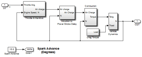 Например, Combustion подсистема включает блок From, отмеченный delta который направляет сигнал от Spark Advance источник. Поскольку Spark Advance является постоянным исходным блоком, однако алгоритм не сообщает о наличии блока.