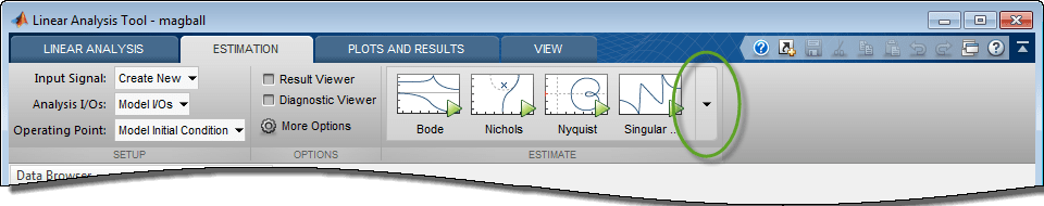 В модуле Model Linearizer на вкладке Estimation (Оценка) в интерактивном режиме настройте входной сигнал, операции ввода-вывода анализа, рабочую точку и другие параметры для оценки частотного отклика.