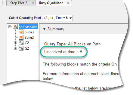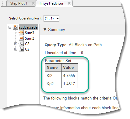 Изменение параметра, сводка линеаризации показывает значения параметров, которые соответствуют выбранной рабочей точке.
