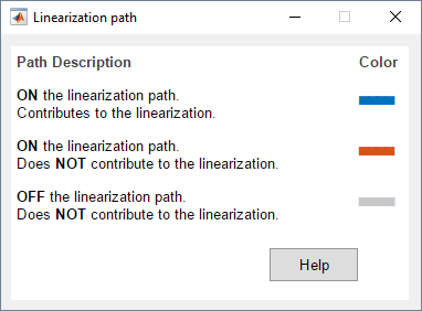 Путь линеаризации - это графическое соединение в модели Simulink ® от входов линеаризации к выходам линеаризации. Блок находится на пути линеаризации, если, по меньшей мере, один вход линеаризации соединен с, по меньшей мере, одним выходом линеаризации через этот блок. Дополнительные сведения о задании входов и выходов линеаризации см. в разделе Указание части модели для линеаризации.