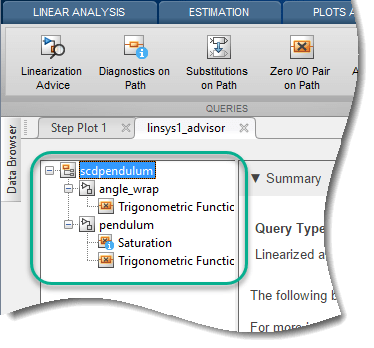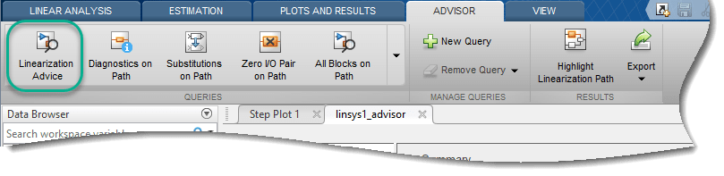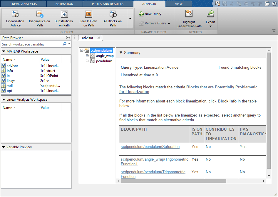 Можно также создать LinearizationAdvisor при линеаризации моделей в командной строке. Затем можно устранить неполадки в результатах линеаризации с помощью advise и find функции. Пример см. в разделе Устранение неполадок с результатами линеаризации в командной строке.