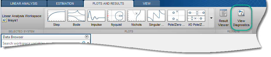 В рабочем пространстве линейного анализа выберите линеаризованную модель, которую требуется устранить. Затем щелкните Вид (View) Диагностика (Diagnostics). Эта опция доступна только в том случае, если перед линеаризацией модели был включен помощник по линеаризации.