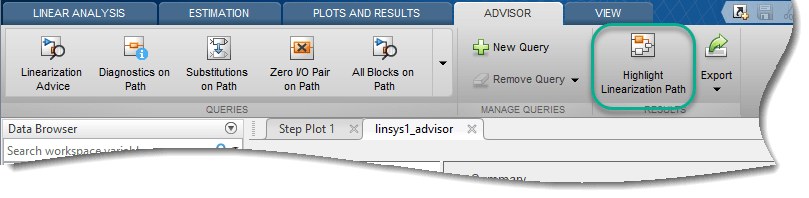 После линеаризации модели с включенным Помощником по линеаризации (Linearization Advisor), чтобы выделить путь линеаризации, в линеаризаторе модели на вкладке Помощник (Advisor) щелкните Подсветить путь линеаризации (Highlight Linearization Path).