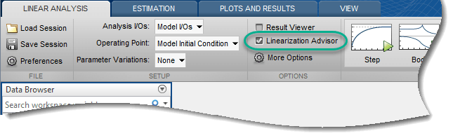 Чтобы включить Помощник по линеаризации (Linearization Advisor), на вкладке Линейный анализ (Linearization Analysis) выберите Помощник по линеаризации (Linearization Advisor).