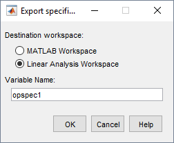 Затем в диалоговом окне Экспорт спецификации (Export Specification) выберите, следует ли экспортировать спецификацию в рабочую область MATLAB или в рабочую область линейного анализа. Затем в поле Имя переменной укажите имя переменной рабочей области, в которую требуется сохранить спецификацию.