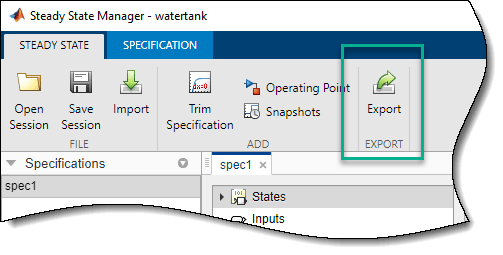 Чтобы экспортировать спецификацию рабочей точки из Диспетчера устойчивого состояния (Steady State Manager), на вкладке Устойчивое состояние (Steady State) или на вкладке Спецификация (Specification) щелкните Экспорт (Export).