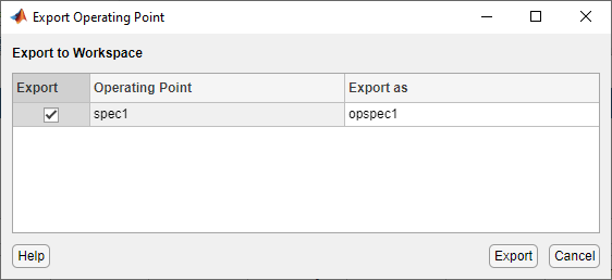 При изменении спецификации рабочей точки в Диспетчере устойчивого состояния (Steady State Manager) или Линеаризаторе модели (Model Linearizer) можно экспортировать спецификацию в рабочую область MATLAB ®. Экспортированные спецификации сохраняются как объекты спецификаций рабочих точек ( см.operspec). Экспорт спецификаций может быть полезен при выполнении нескольких операций обрезки с использованием одного или аналогичного набора спецификаций. Кроме того, можно экспортировать интерактивно редактируемые спецификации рабочих точек при необходимости использования findop для выполнения нескольких операций обрезки с одной компиляцией модели. (Для получения информации о нескольких спецификациях см. раздел «Рабочие точки пакетного расчета в установившемся состоянии».)