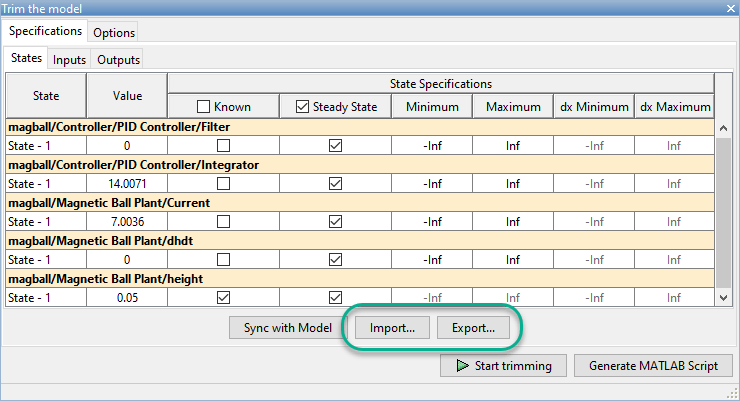 Можно также импортировать сохраненные спецификации рабочих точек в Диспетчер установившихся состояний (Steady State Manager) или Линеаризатор модели (Model Linearizer) и использовать их для интерактивного вычисления отсеченных рабочих точек. Импорт спецификации может быть полезен, если требуется обрезать модель до спецификации, аналогичной ранее сохраненной. В этом случае можно импортировать спецификацию и в интерактивном режиме изменить ее. Затем можно экспортировать измененную спецификацию или вычислить из нее отсеченную рабочую точку.