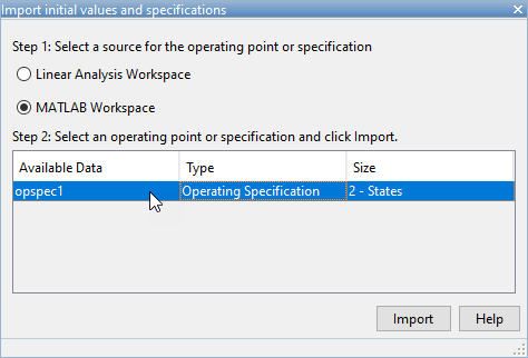 Затем в диалоговом окне Импорт начальных значений и спецификации (Import initial values and specification) выберите, требуется ли импортировать спецификацию из рабочей области MATLAB или из рабочей области линейного анализа. Затем в таблице щелкните спецификацию, которую требуется импортировать.
