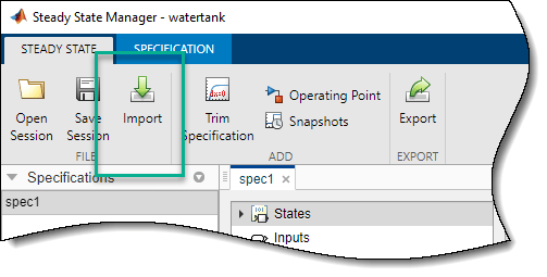 Чтобы импортировать спецификацию операционной точки в Диспетчер устойчивого состояния (Steady State Manager), на вкладке Устойчивое состояние (Steady State) щелкните Импорт (Import).