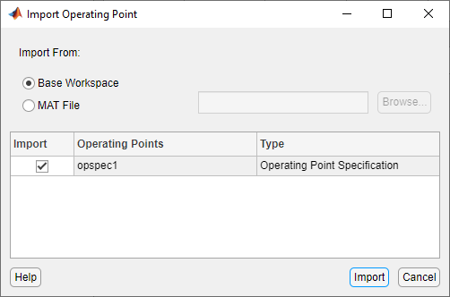 В диалоговом окне «Импорт рабочей точки» выберите, требуется ли импортировать спецификацию из рабочего пространства MATLAB или из MAT-файла. Затем в таблице в столбце Импорт выберите спецификацию, которую требуется импортировать.