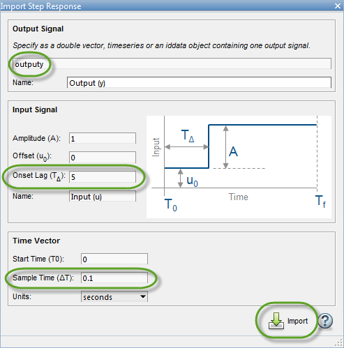 В диалоговом окне «Импорт ответа» введите сведения о данных ответа. Например, для данных ответа на шаг, хранящихся в переменной outputy и отбирают каждые 0,1 с: