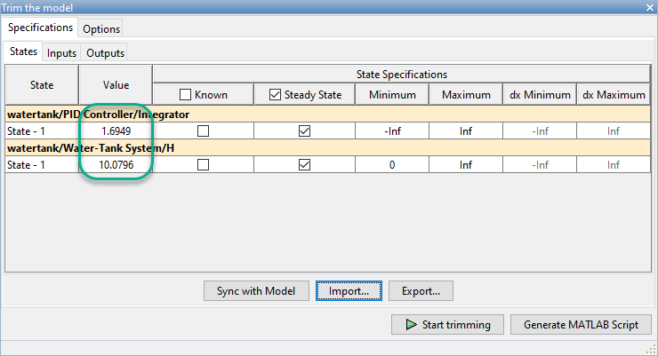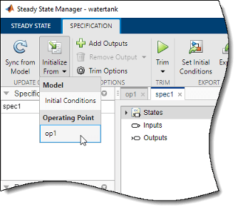 Поиск оптимизированной рабочей точки с помощью состояний в t = 10 в качестве начальных значений на вкладке Спецификация (Specification) щелкните Обрезать (Trim).