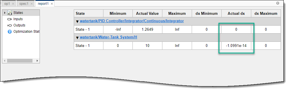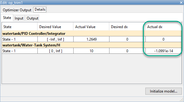 Производная по времени каждого состояния, dx, фактически равно нулю. Это значение производной состояния указывает, что рабочая точка находится в установившемся состоянии.
