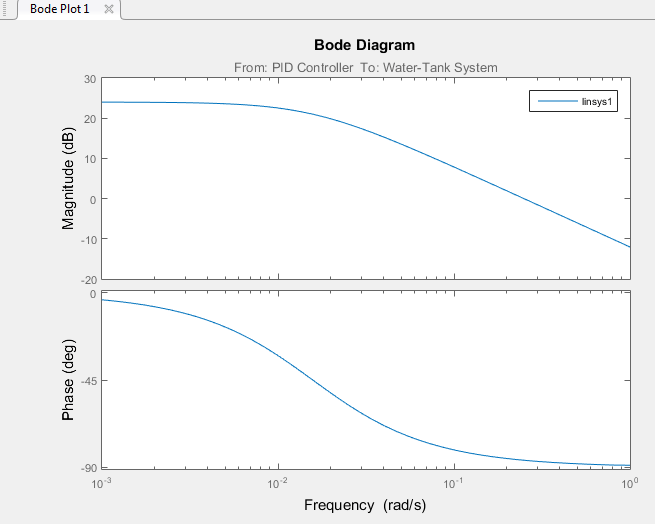 Bode. Появится график Боде линеаризованного растения, и линеаризованное растение linsys1 появляется в рабочем пространстве линейного анализа.